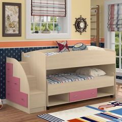 Кровать-чердак "Дюймовочка-4/3" рассчитана на двоих детей, так как объединяет два полноценных спальных места. Выдвижная нижняя кровать может устанавливаться в удобном положении для сна в ночное время и убираться в дневное время. Под кроватью имеется ящик для белья и открытые ниши. В лестнице предусмотрены выдвижные ящики для хранения вещей. Такой уголок экономит пространство в детской комнате. Кровать подойдет детям от 2 до 18 лет.