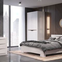 «кремовый белый», который уже успел полюбиться клиентам фабрики по серии «Марлен», но отличается более современным дизайном. В нем отсутствуют замысловатые декоративные элементы и колонны, на первый план выходят прямые линии. Украшением комплекта служат оригинальные итальянские ручки золотистого цвета. В оформлении фасадов комода сделан необычный ход. Некоторые линии, делящие ящики на, казалось бы, самостоятельные отсеки, на самом деле являются фрезеровкой. Кровать оснащена мягким тканевым изголовьем, что является сейчас безусловным трендом.