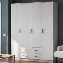 Шкаф комплектуется четырьмя распашными створками и разделен вертикальными перегородками на 3 отделения. По краям располагаются бельевые отделения шириной 384 мм. В каждой из них устанавливается по четыре полки. Посередине отделение шириной 768 мм. В нижней части отделения расположена секция с двумя выдвижными ящиками, в верхней - платяное отделение высотой 1512 мм с одной полкой сверху и металлической штангой.